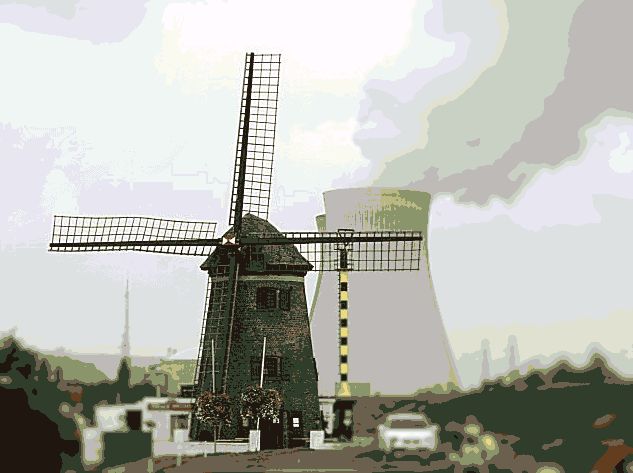 Wer Doel ins Deutsche übersetzt, wird sich wundern: das Ziel. Und auch im Dorf gibt es so etwas wie einen Lichtblick. Auf dem Grasdeich, der das Dorf vor den Launen der Schelde schützt, steht eine Windmühle, darin ein kleines Restaurant. Es soll die älteste Mühle in Belgien sein. Gerade ist eine Schulklasse angekommen. Am Deich verläuft ein Radweg. Kurz kehrt das Leben zurück.; Kinder johlen und lachen. Alle tragen neongelbe Warnwesten. Im Hintergrund dampft das AKW.