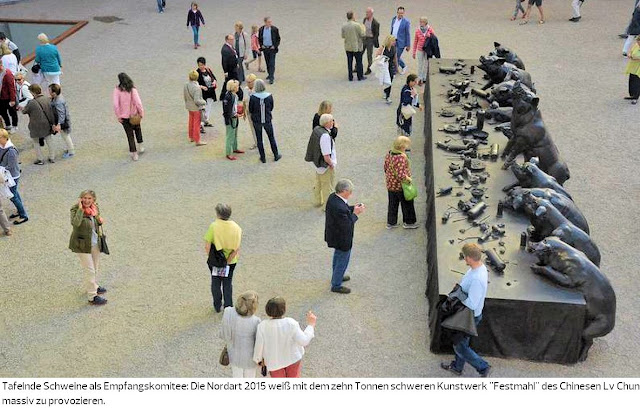 In aller Ruhe Lieblingsstücke erkunden, fiel schwer beim ersten Rundgang durch die von Chefkurator Wolfgang Gramm mit seiner Ehefrau Inga Aru zusammenstellten Schau. In der euopaweit umfassendsten Ausstellung mongolischer Kunst war das Gedränge besonders groß. Lv Chuns provozierendes Großwerk Festmahl mit elf tafelnden Schweinen, wie ein Empfangskomitee gegenüber des Eingangs positioniert, verlockte zum Foto. „Ich komme noch mal wieder,“ entschied Besucher Ewald Plehwe, wie viele andere Stammgäste auch. „Man sieht gar nichts von den Kunstwerken.“