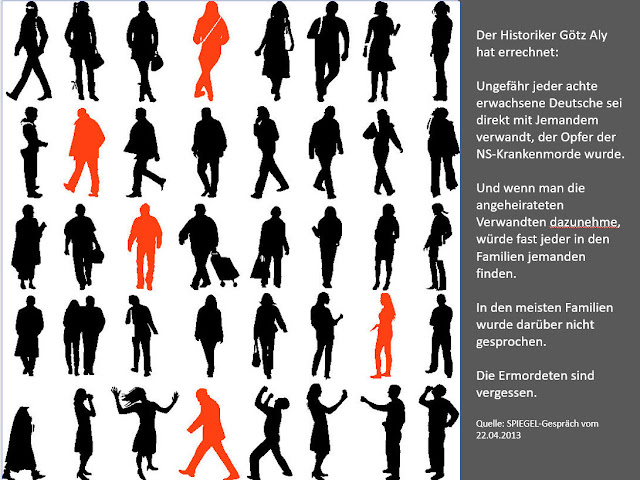 Jeder achte heutige Deutsche ist direkt mit jemandem verwandt, der Opfer dieser Morde wurde. Und wenn Sie die angeheirateten Verwandten dazunehmen, würde fast jeder in der Familie einen finden. Aber in den meisten Familien wurde darüber nicht gesprochen. Die Ermordeten sind vergessen."(Götz Aly) -