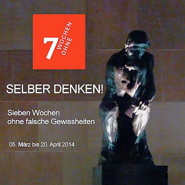 Selber denken!7 Wochen ohne falsche Gewissheiten – das Motto klingt so selbstverständlich, erweist sich aber in der Praxis als Herausforderung. Denn wenn wir uns in der Fastenzeit darin üben wollen, geht es nicht um sieben Wochen Vernunftherrschaft. Es kann, im Gegenteil, ganz schön unvernünftig sein, selber zu denken. Das Bild vom „Denken ohne Geländer“ hat Hannah Arendt geprägt. Es kann nämlich durchaus gefährlich sein, Denkverbote zu ignorieren und den Chef auf einen Fehler hinzuweisen. Mut braucht es auch, Gewohnheiten und Traditionen infrage zu stellen – im Job, in der Familie oder in der Kirche. Und wer gern nörgelt über zu wenig Grün in der Stadt oder blöde Kandidaten zur Wahl, sollte mal den Zuschauerraum verlassen und selber etwas auf die Beine stellen. Dafür muss man den eigenen Kopf gebrauchen – und zunächst mal einen haben!
